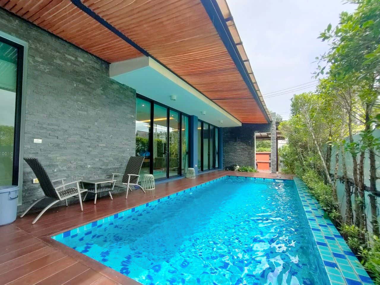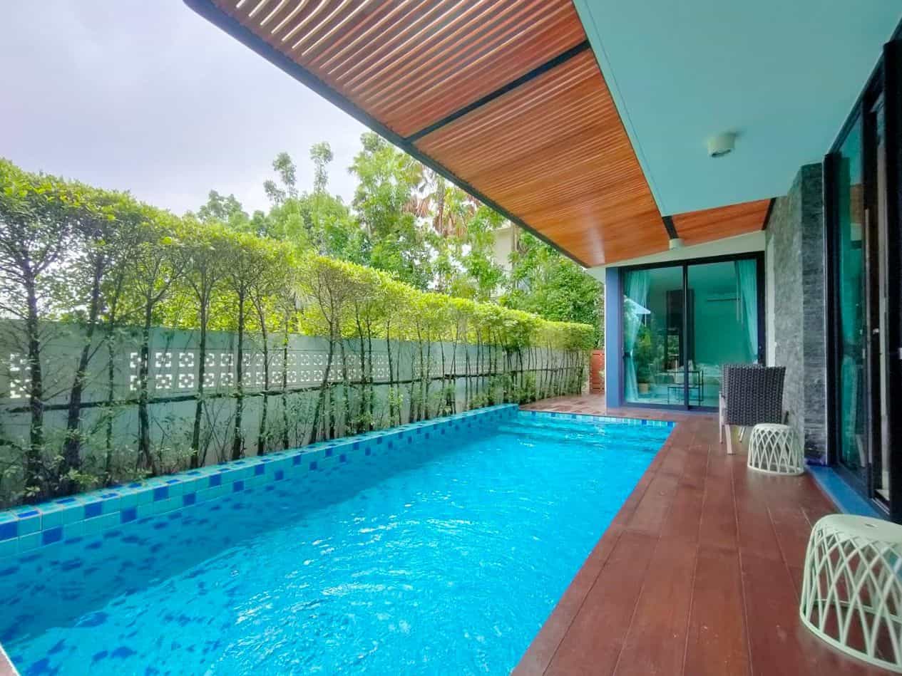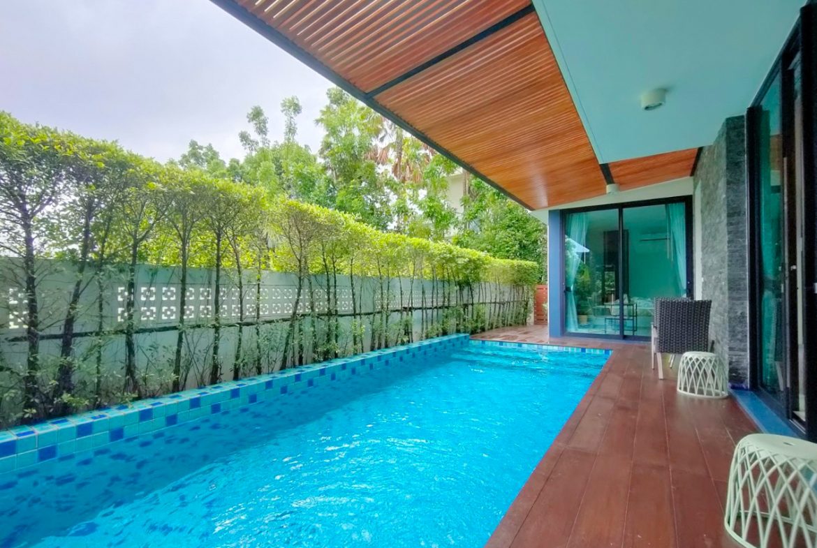 The private pool measures 8 by 3 meters with a depth of 1.3 meters, perfect for relaxation and entertainment. The villa is fully furnished and includes a functional kitchen, ready for immediate use.