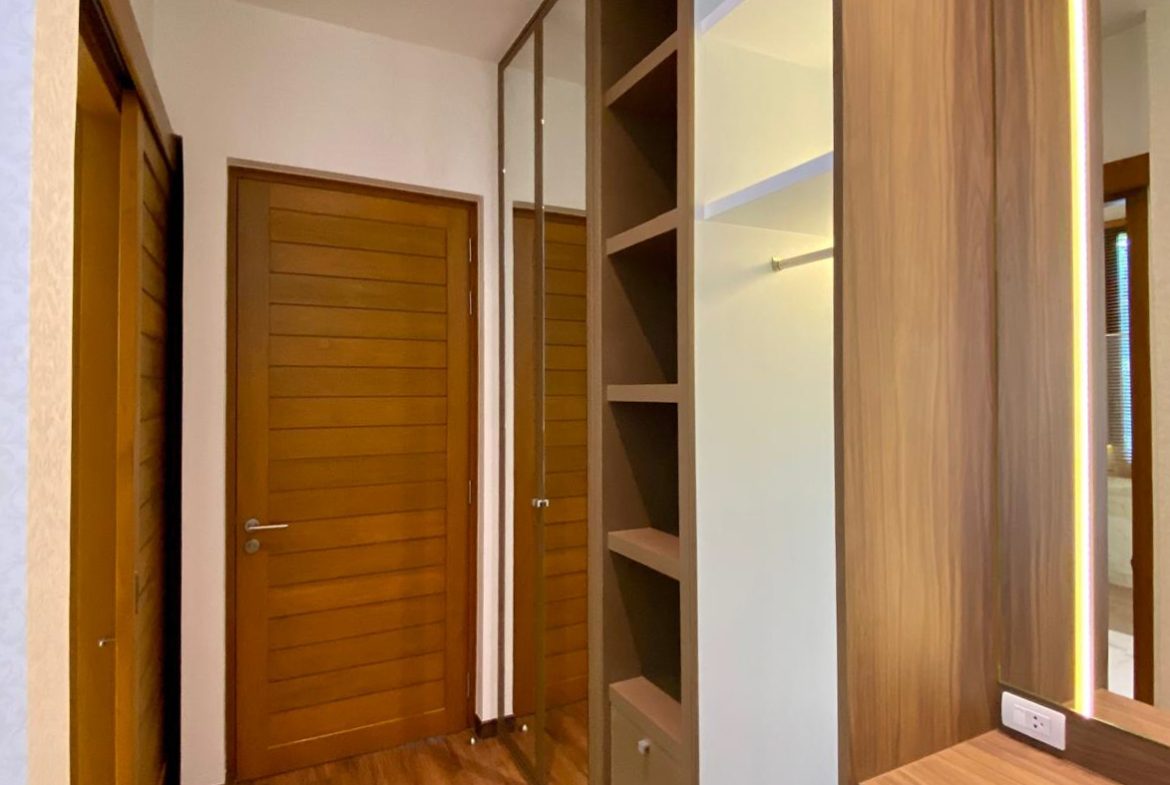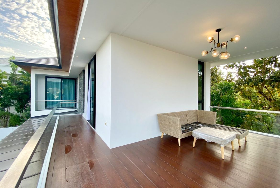 The villa includes three bedrooms, each with its own en suite bathroom, balcony, and pool views. The master bathroom features a bathtub, adding an extra touch of luxury. There are two car parking spaces available for your convenience.