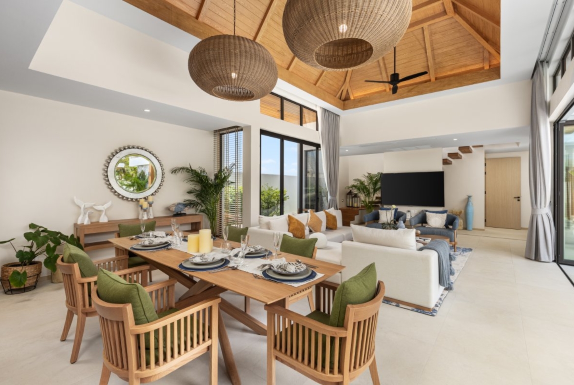 The show villa exemplifies modern tropical living. Designed with practicality and versatility in mind, the main living areas and master suite are located on the ground floor, while an additional upper-level room offers flexibility for dual masters or multipurpose use. The expansive outdoor sala, complete with a dining area for eight and a built-in BBQ, invites residents to embrace indoor-outdoor living in style.