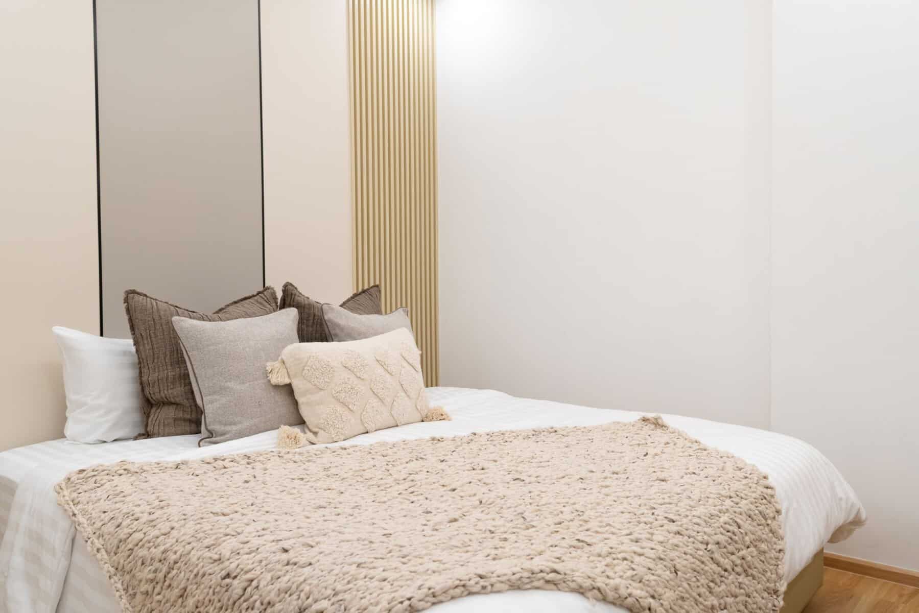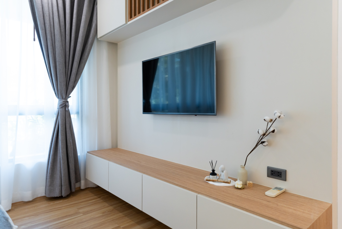 Crafted in a contemporary Japanese style, the predominant presence of pine wood tones is evident in elements like the unit’s ceiling and built-in furniture. The condominium features: