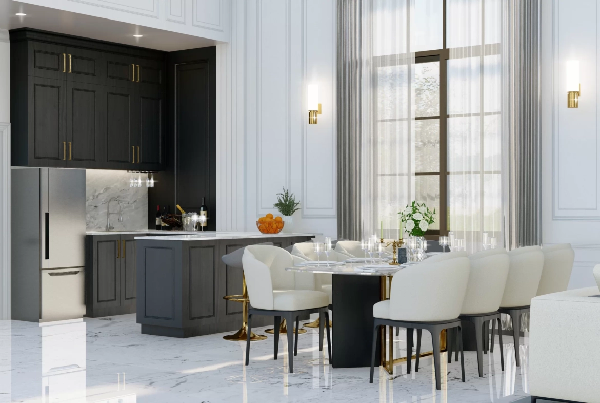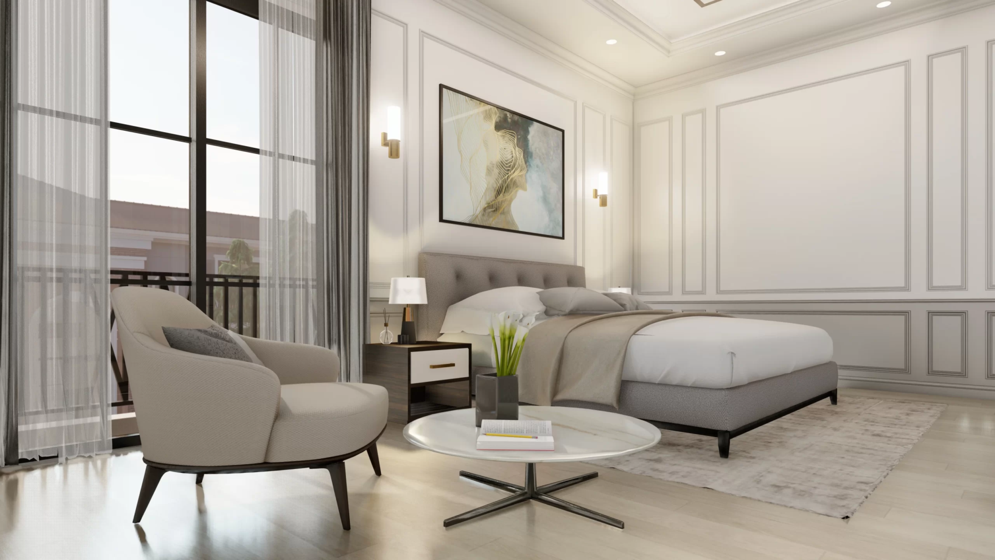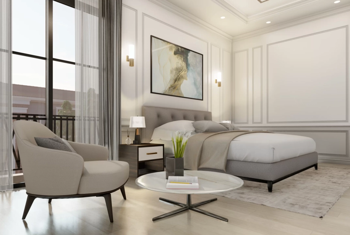This project encompasses a total of 20 two-story homes, each artfully blending modern and classic European design elements. The ground floor serves as the heart of the home, featuring a welcoming hall that doubles as a living and dining area, complete with a contemporary kitchen. Some of the larger units also include a guest bedroom on this level. The design allows for good integration of indoor spaces with outdoor terraces and lush gardens.
