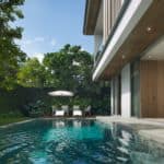 Villa Amarisa spans three levels starting at the lobby with stairs going down, and a lift connecting all levels. The second level has four bedrooms, including a master suite with private balconies and wide sea views. On the ground level, a fitness studio with gym equipment, and the second master suite with direct access to the pool. Also found on this level is a huge living and dining area, with a fully equipped kitchen and breakfast bar. Floor-to-ceiling glass doors lead out to the 24-metre pool and shaded terrace with alfresco dining and plush sun loungers. All living areas and bedrooms enjoy super-high 3-metre ceilings to enhance the feeling of lightness and space.