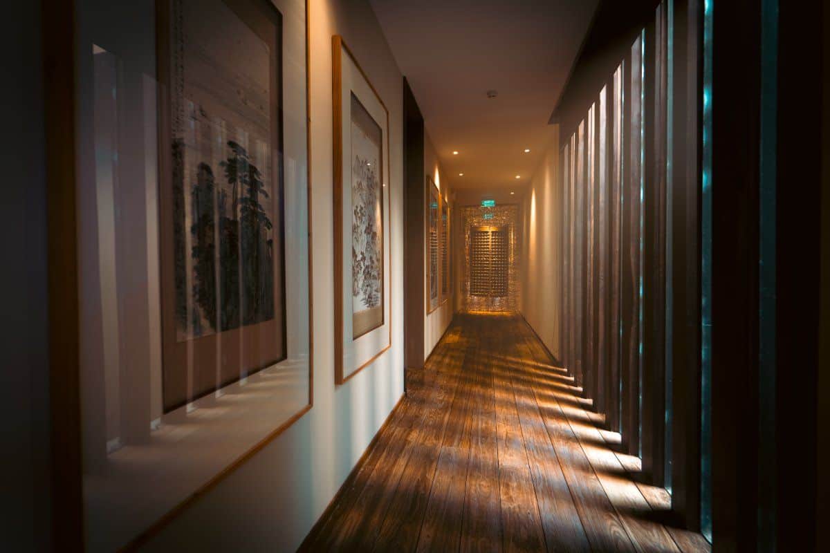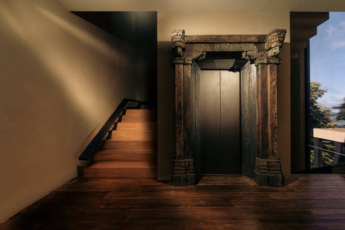 Even the lift is magnificent, framed by intricate wooden doorway frames, and with dramatic black interiors highlighted by a gold-plated leaf. Allowing easy mobility to the elderly, the elevator deftly takes you to the lower levels, where the polished teak hardwood floors sweep into five spacious bedroom suites and an expansive living and dining room.