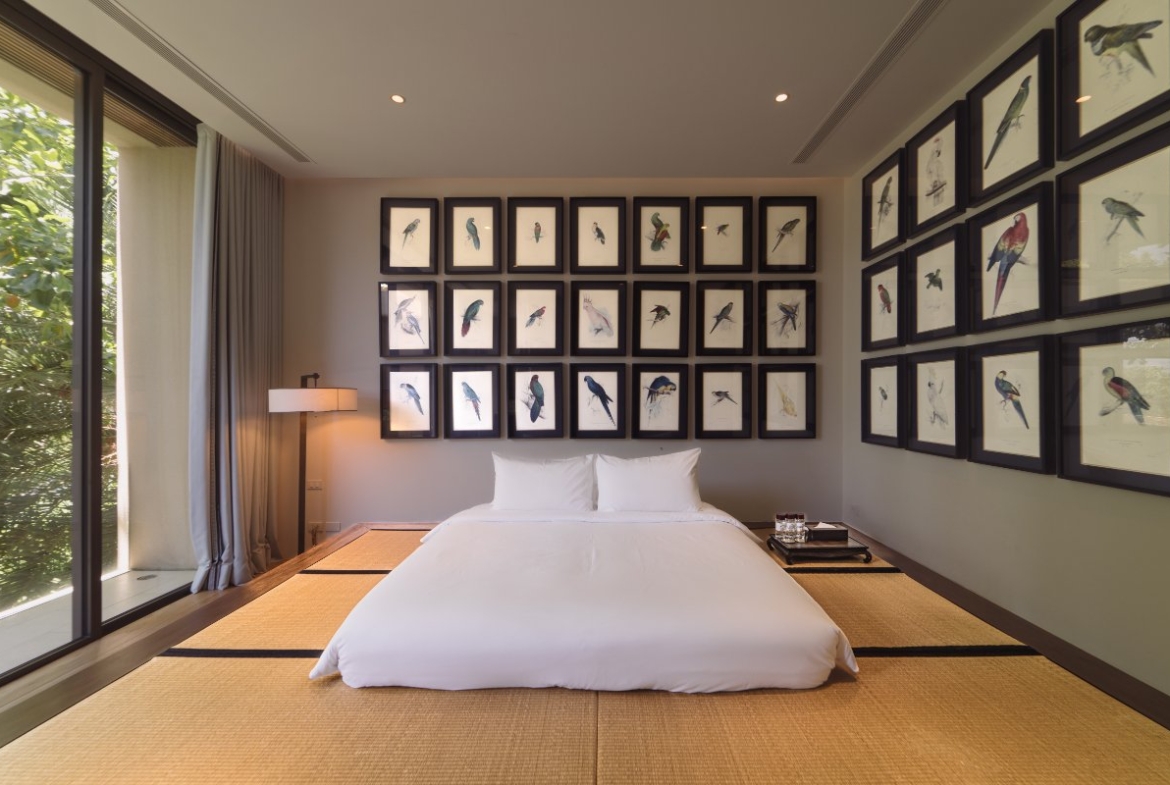 Reminiscent of Japanese tatami-style rooms, three single beds rest on an extended wooden raised platform, surrounded by framed watercolours of exotic birds. A great room for children, it has ceiling-high glass sliding doors that open onto a small private balcony with views of the garden’s tropical trees and plants.
