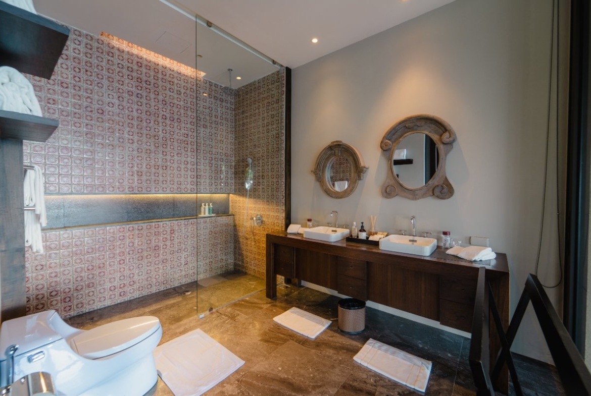 All five luxurious bedrooms in Villa Amarisa feature wooden floors with ceiling-high glass sliding doors leading onto a private balcony, some with stunning sea views and others with pleasing garden vistas. Each suite is unique in its décor and furnishing, complete with an ensuite with spacious Moroccan-tiled showers and a double vanity.