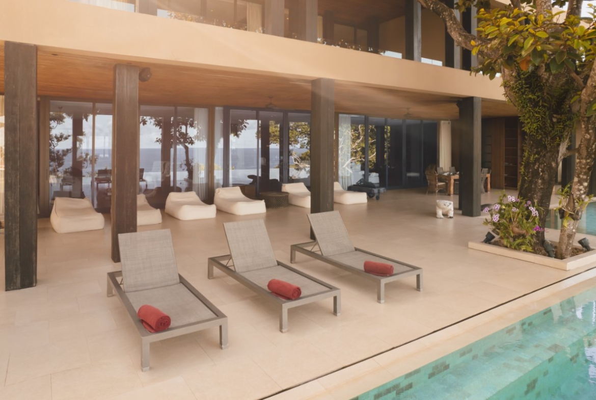 The villa’s lobby offers fantastic sea views through the ceiling-high glass windows, flanked by ancient wood carved Indian pillars. Stairs and a lift connect to the lower two levels, where the wide sandstone-wall corridors connect the living spaces. The airy, open-plan living and dining area is the social hub of the villa, a casual and comfortable setting with an oversized L-shaped sofa facing the TV, a solid wood dining table for 15 guests with a large, chic chandelier, and two more sofas and a collection of glamorous wingback armchairs arranged around a coffee table. This room also features a full-service kitchen and a breakfast bar, perfect for that first cup of coffee. Just off the living room is a fitness studio with gym equipment and yoga mats.