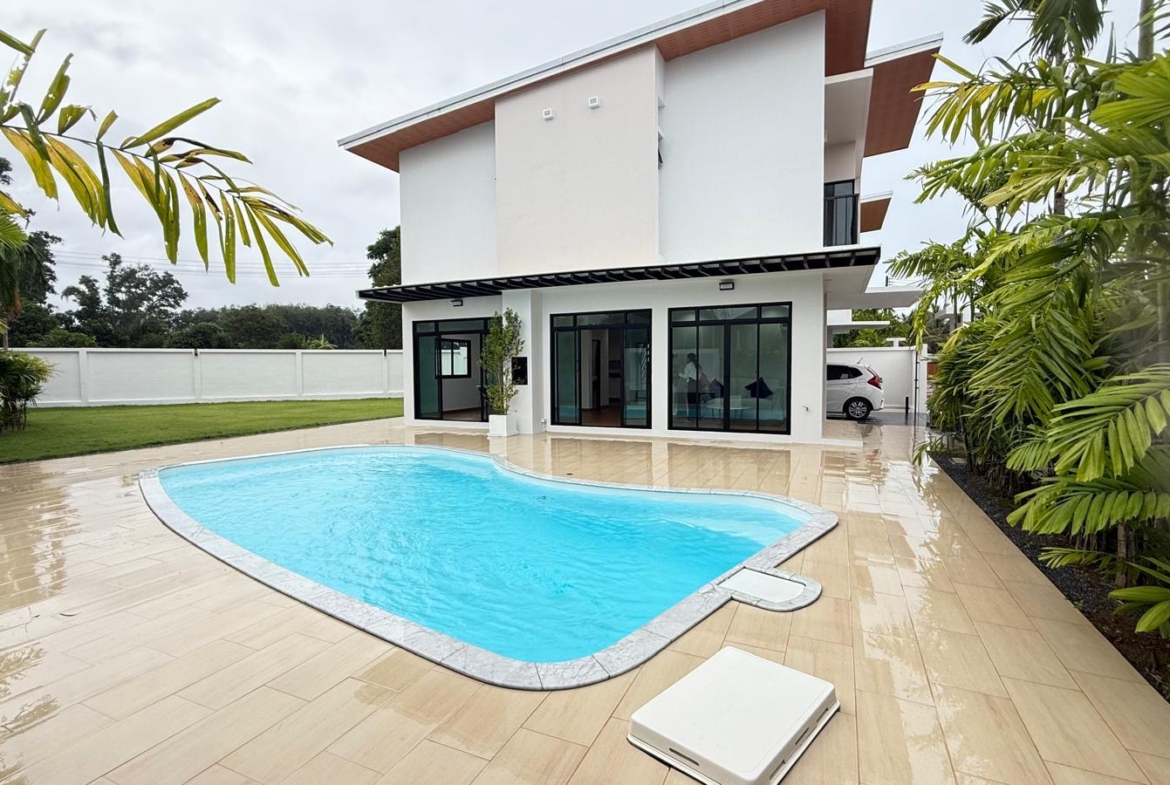 Set on a generous 528 sqm land plot, this beautifully designed villa features 3 bedrooms, 3 bathrooms, and a built-up area of 350 sqm (123 sqm indoor and 227 sqm outdoor). The layout includes an open-plan living area, a fully equipped Western kitchen, and seamless indoor-outdoor flow leading to a private 4.4 x 8.3 m swimming pool surrounded by a landscaped tropical garden.