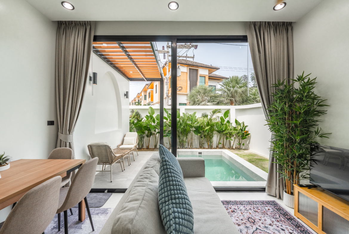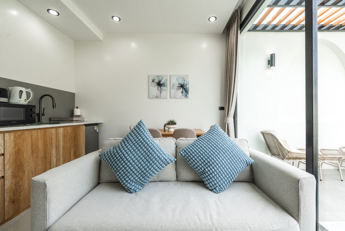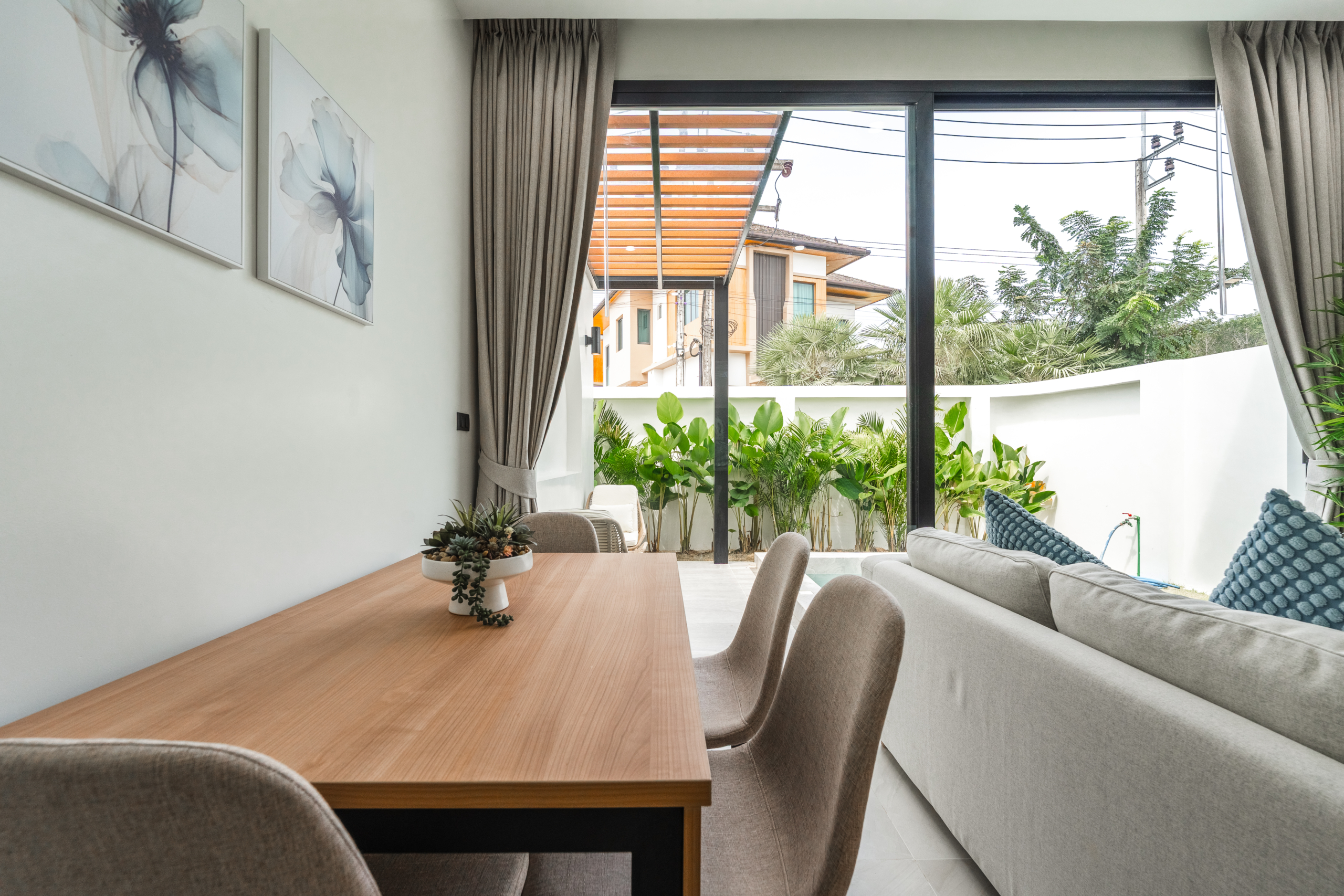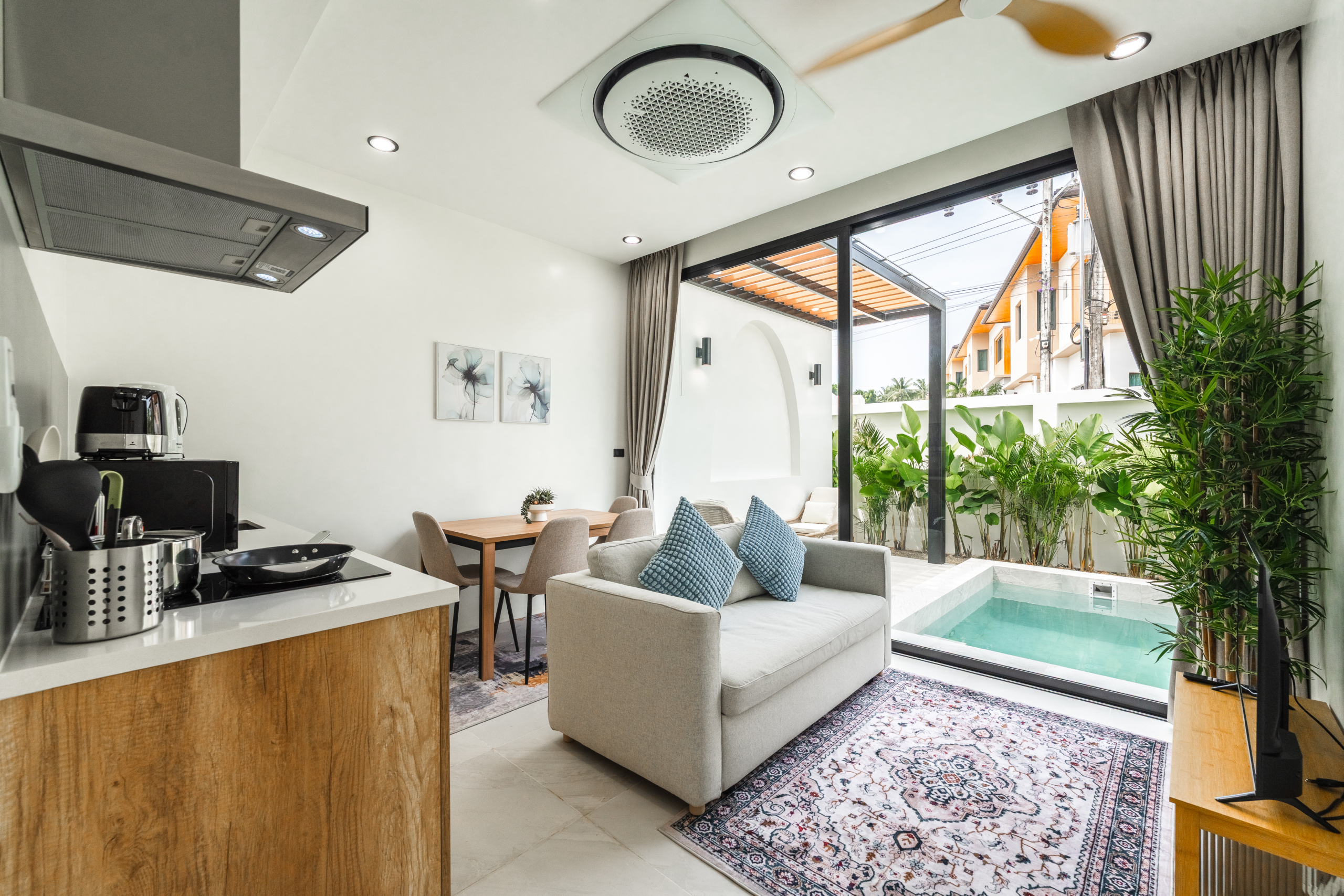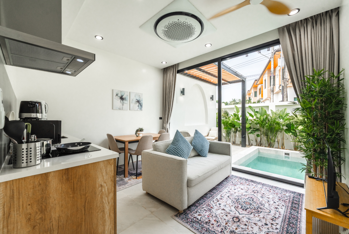 The villa includes one bedroom, one bathroom, a fully equipped kitchen, and an open-plan living and dining area. Designed for easy long-term living, the home offers a peaceful setting while remaining just minutes from Laguna, Boat Avenue, Bang Tao Beach, and local restaurants.