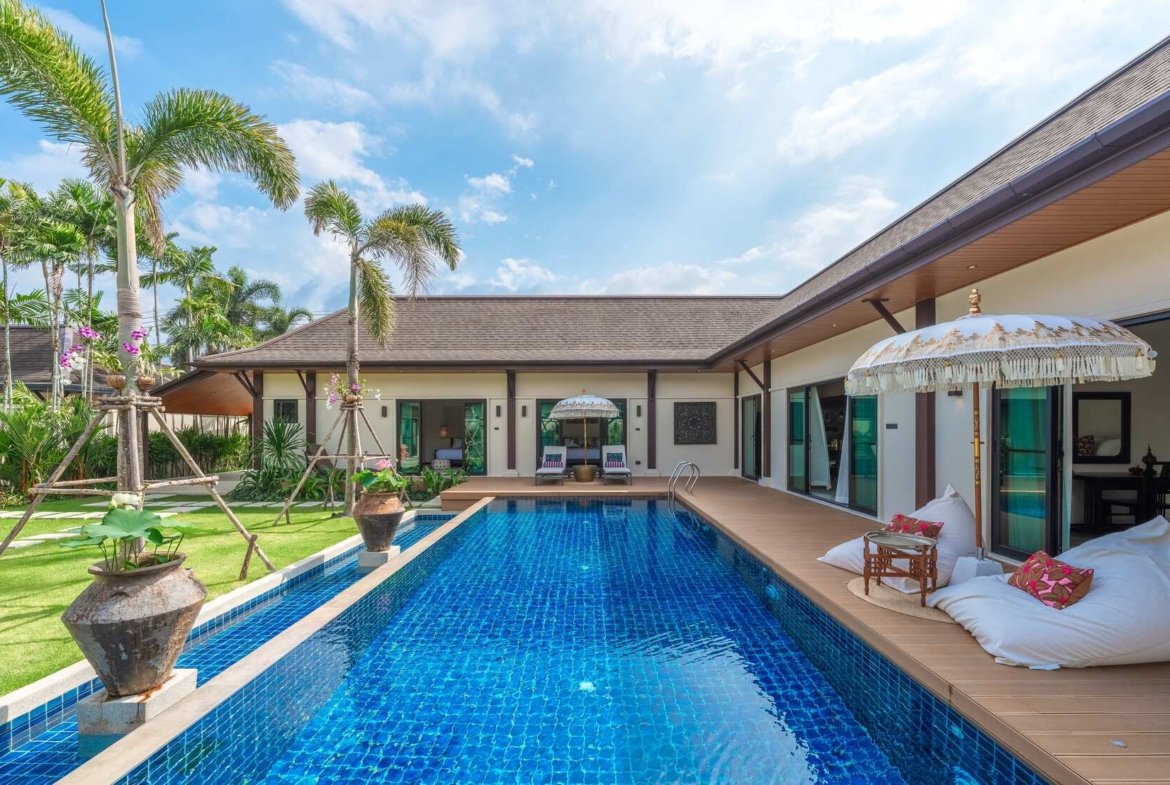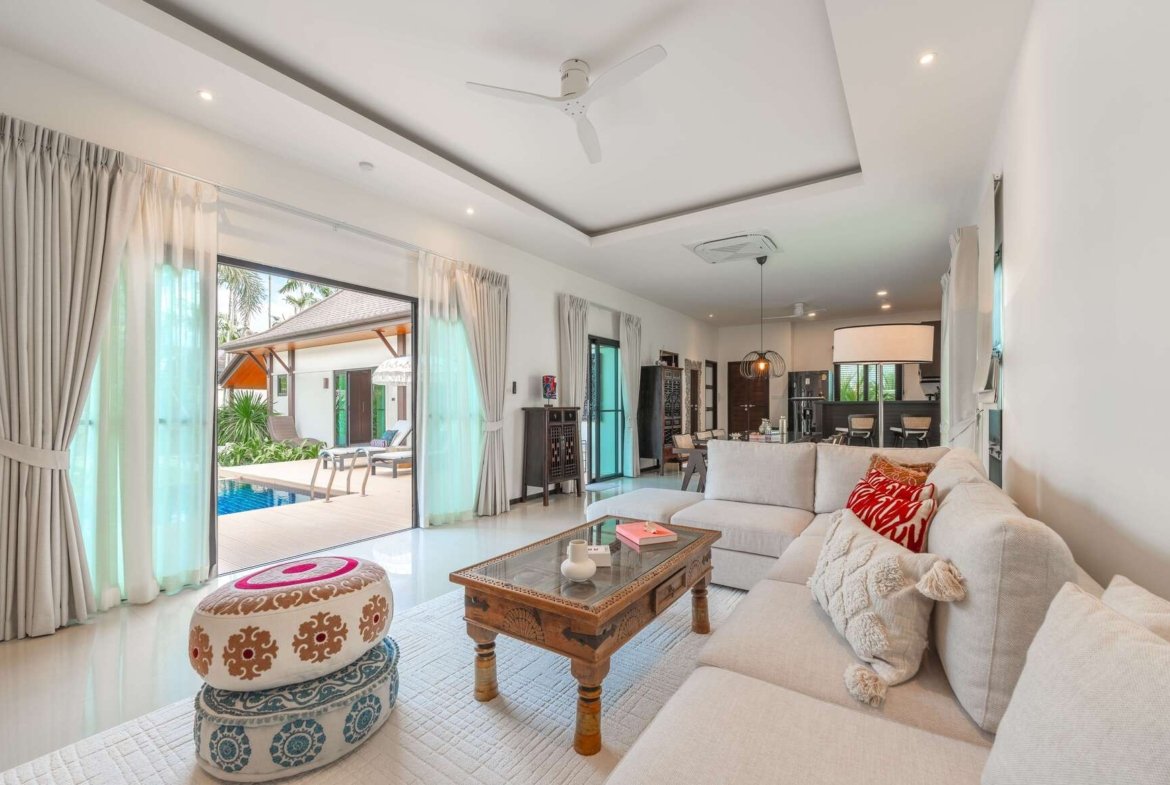 The villa offers spacious indoor and outdoor living areas with an open-plan design that connects seamlessly to the private swimming pool and garden. Large windows allow natural light throughout the home, creating a bright and comfortable atmosphere ideal for long-term living in Phuket.
