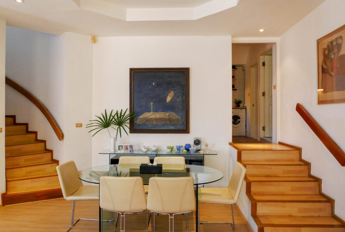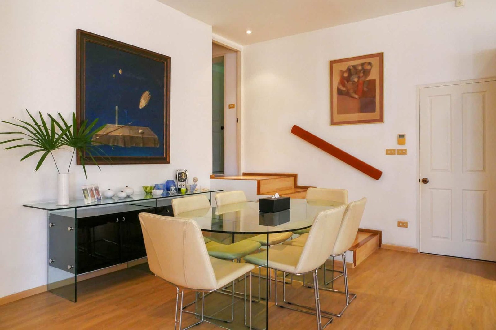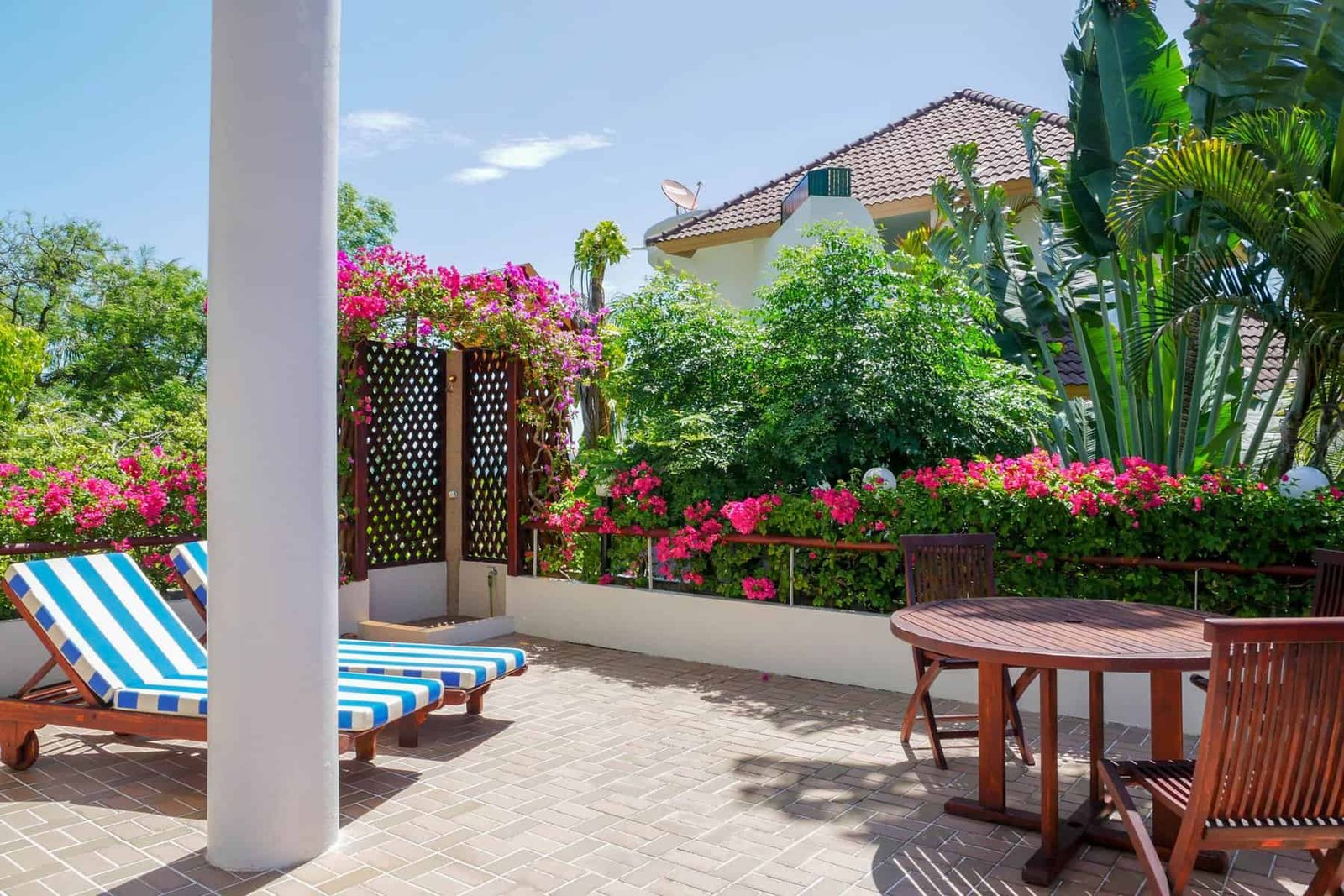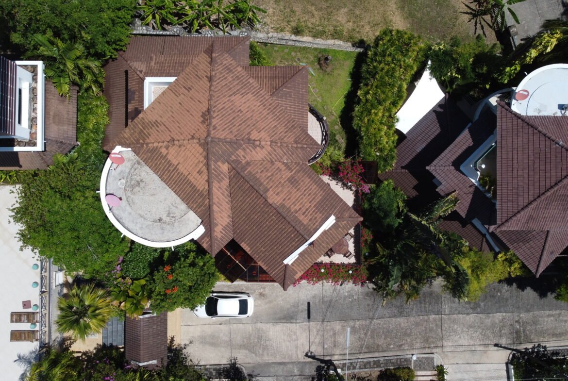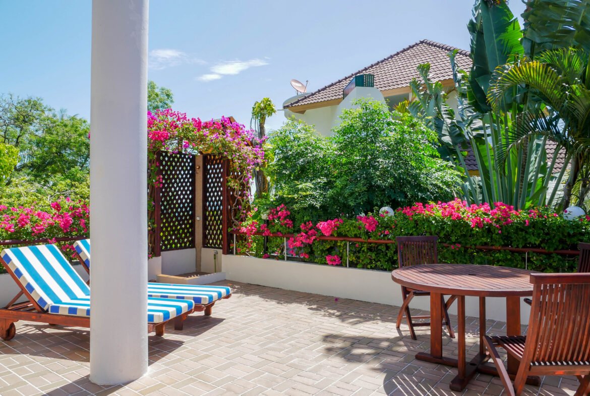 The nicely designed kitchen comes with a big refrigerator, freezer, microwave, gas stove top and dishwasher. This room also has lots of wood cabinets and counter space. There is a maid’s quarters for a live-in maid, laundry room and a Thai kitchen at the back of the living area. Mature gardens with a sprinkler system surrounds the home. It is a manageable size and well maintained.