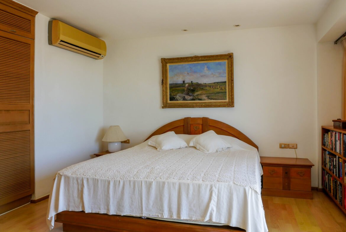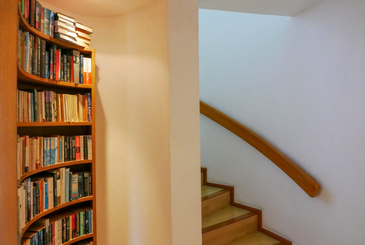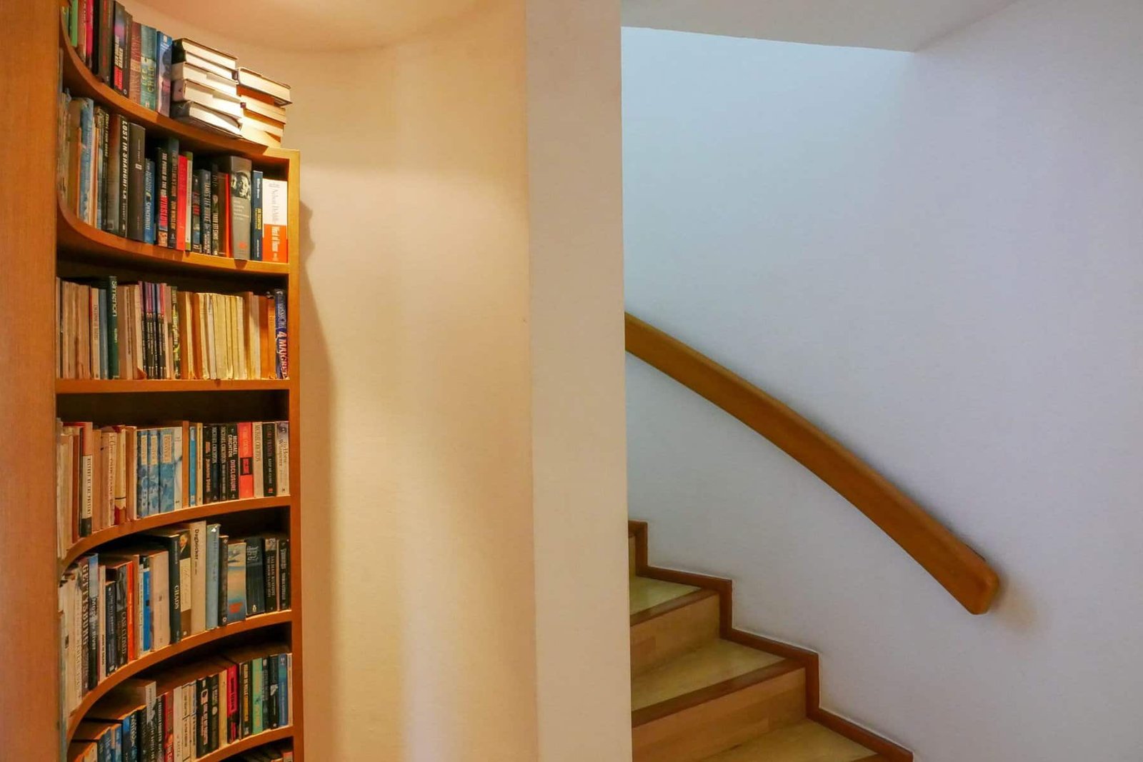 One the second floor are two guest bedrooms with one shared bathroom and the stunning top floor has the master bedroom with ensuite bathroom, walk-in wardrobe and balcony. The master bedroom has an ensuite with a Jacuzzi bathroom and shower, dressing area, safe, minibar and coffee machine. All the rooms have built-in wood shelving and the house has wood flooring throughout.